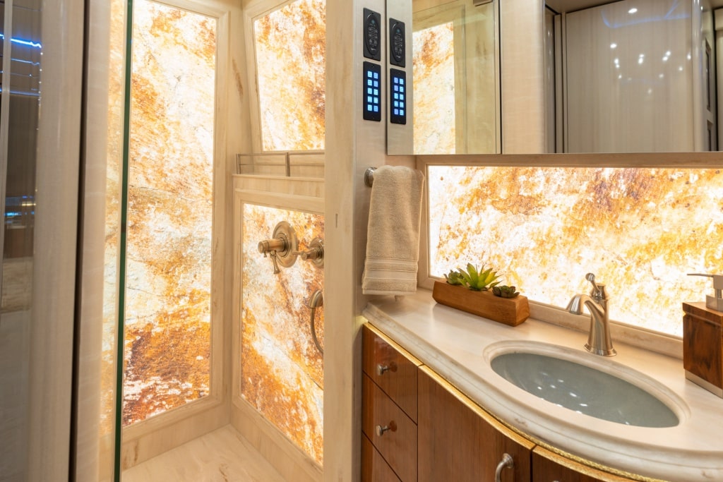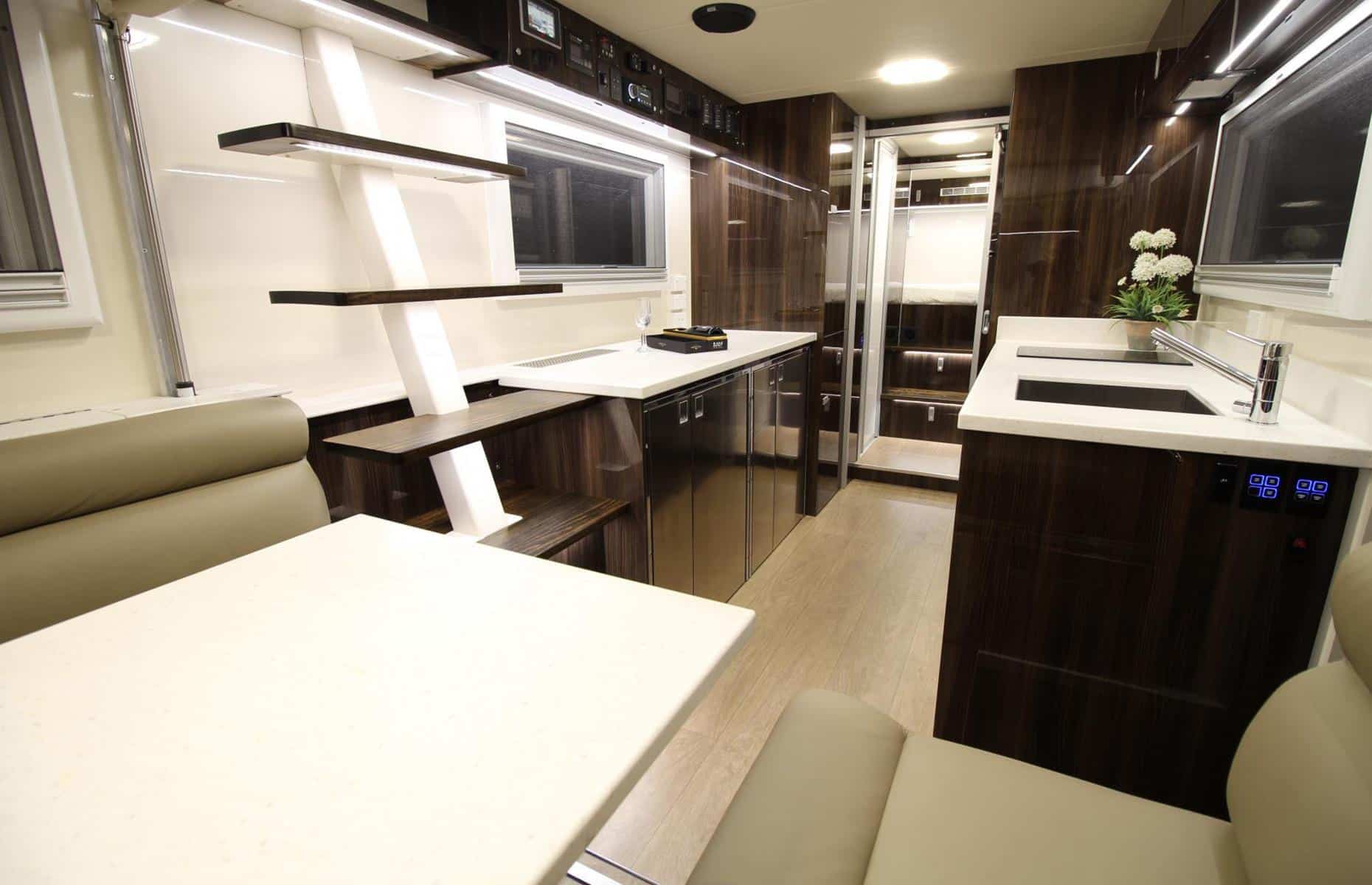 Luxusní koupelna se sprchovým koutem a keramickým umyvadlem je nedílnou součástí ložnice. Obytňák nabízí také neméně působivou kuchyň s vysoce kvalitními spotřebiči včetně myčky nádobí, japonské varné desky a kávovaru na espresso. Milovníci vína se také mohou rozhodnout pro speciální vinotéku, do které si na cestách uloží své oblíbené lahve.