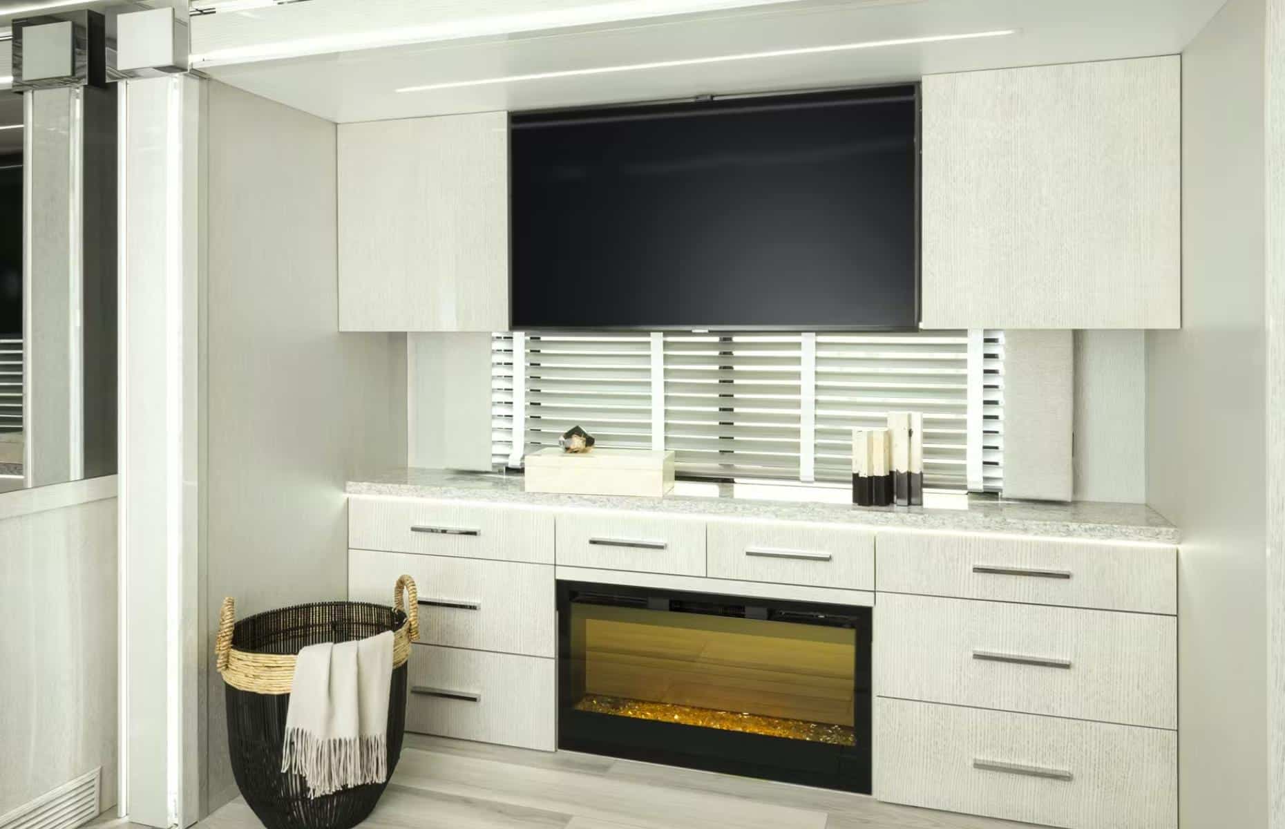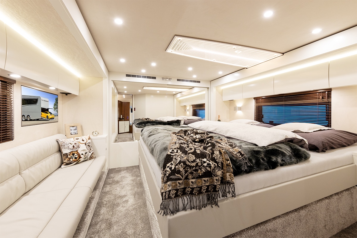 Samozřejmostí tohoto vozu je špičkové bytové vybavení – například nerezová lednička Viking, indukční varná deska Wolf či manželská postel velikosti King. Ta je vybavena nastavitelnou matrací. Pro vaši zábavu máte v ložnici k dispozici zatahovací televizi Samsung 4K a soundbar Bose.