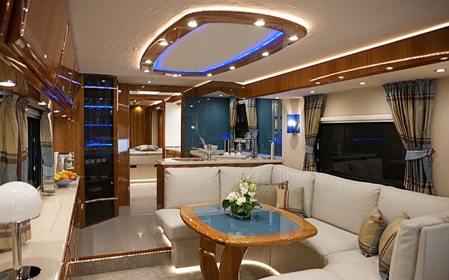 Marathon Coach, známý svými inovacemi, řemeslným zpracováním a eklektickým designem, vyrábí zcela unikátní obytné vozy a model #1325 není výjimkou. Tento vznešený obytný vůz oslní odvážnými detaily exteriéru. Ale to není nic ve srovnání s tím, co čeká uvnitř. Tento doslova vymazlený model je vybaven stylovým příslušenstvím, zářivými LED světly a technologií pro chytrou domácnost včetně podlahového vytápění. Marathon Coach je prostě obytným autem bohatých a slavných. Nutno doplnit, že uvnitř má opulentní interiér výrazné zlaté detaily, kožený nábytek a plyšové! chlupaté koberečky pro maximální pohodlí majitele.
