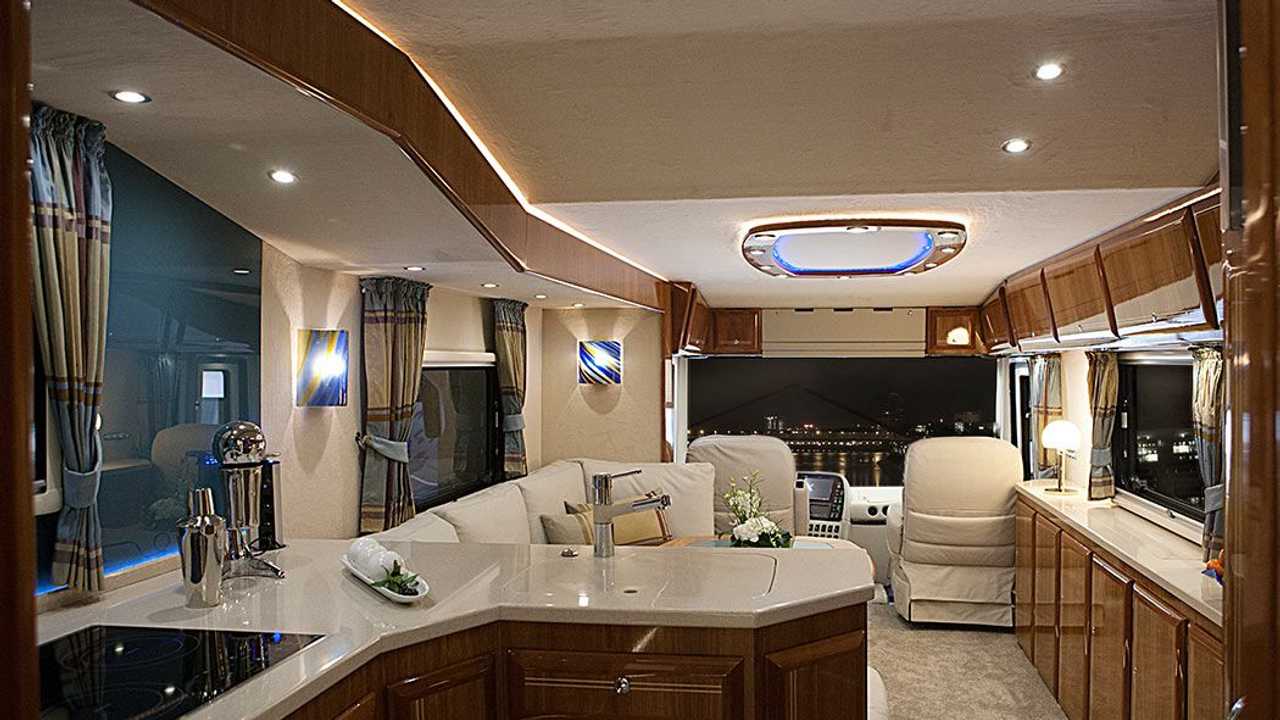 Obytný vůz majitelům poskytuje samozřejmě i skříně s dřevěným efektem, krbovou vložku v obývací části a vyskakovací GPS palubní monitor. Kuchyně má na míru zase vestavěný úložný prostor pro láhve vína, chladničku Sub-Zero a nastavitelný jídelní stůl, který lze rozložit pro pořádání větších gurmánských setkání s přáteli. 3D prohlídku vozu si spustíte na tomto odkazu.