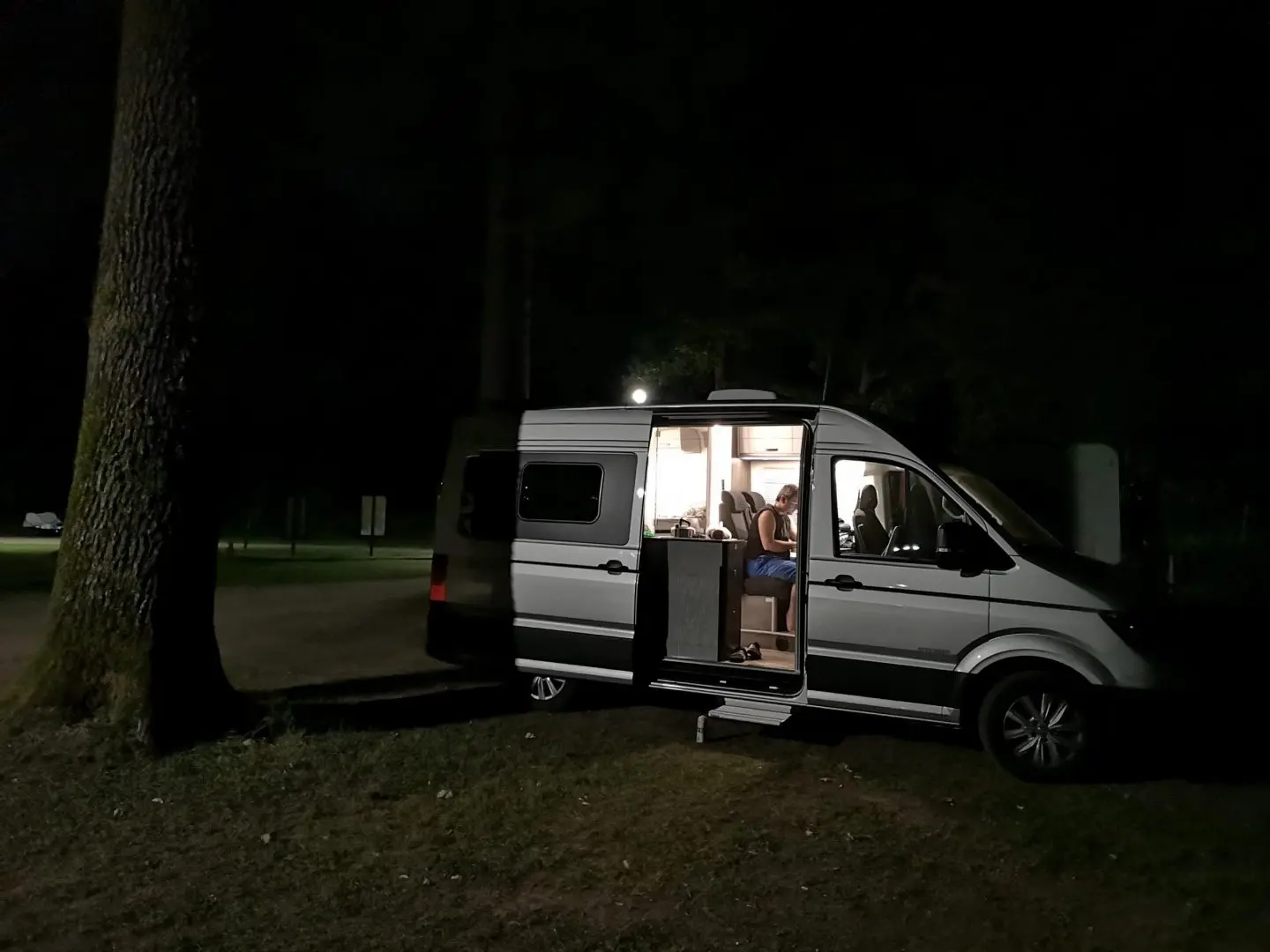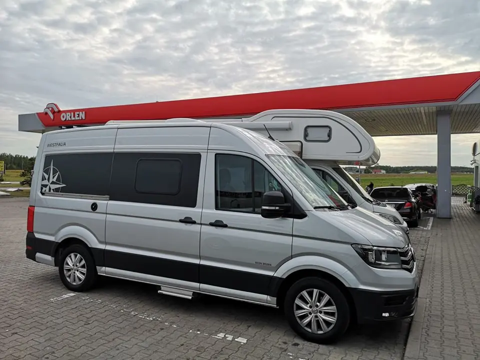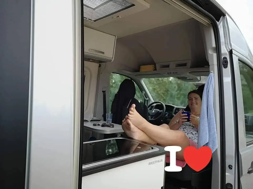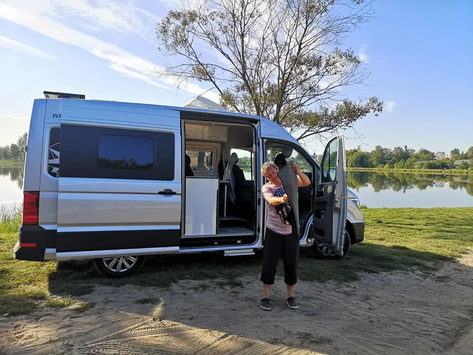 V kempu jsme ještě nebyli. Tedy až na jedno odpoledne v Suwalkach, kde jsme dělali asi hodinu servis auta a pak odjeli nocovat k jezeru. Nicméně máme za sebou noci i na parkovištích a popravdě – já jsem už tak za ty roky vycvičená, že to neřeším. Když otevřu dveře a někdo se podívá – tak mi to nevadí a když chci soukromí, tak ty dveře zavřu, zatáhnu roletky, nandám na přední sklo clonu a je to. Takže tady rozdíl nevidím žádný. Je to stejné, jako když cestuješ s klasickým obytňákem.