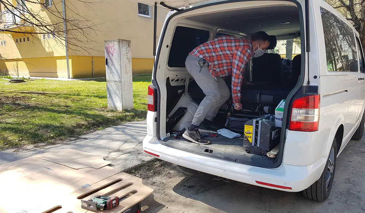 Když je Féllix využívaný i jako pracovní auto, měli jsme trochu omezené možnosti jeho přestavby a museli jsme si to v něm rozplánovat tak, aby se dal snadno transformovat. Féllix byl původně policejním autem v Belgii. Z této doby mu zůstala „pevná povaha“ v podobě pancéřových dveří, sirén… Jelikož to však byl osmimístný Transporter, museli jsme udělat nějaké úpravy, abychom se v něm cítili jako doma.