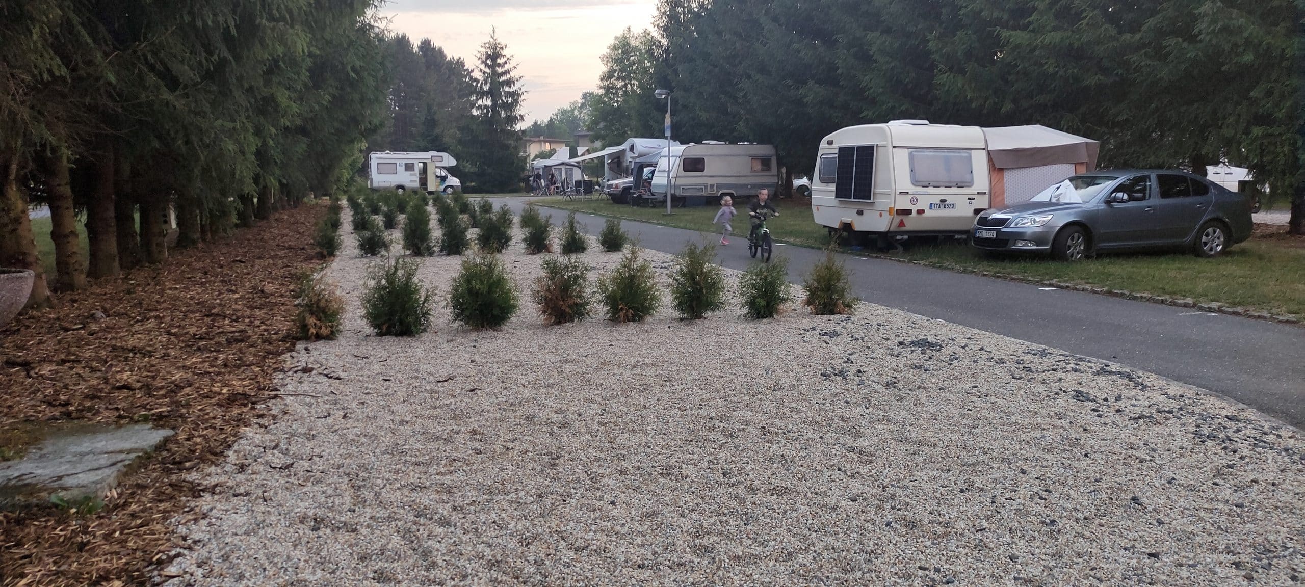 Po příjezdu necháte vozidlo u hlavní brány a zavítáte na recepci, kde si domluvíte počet dní, které zde chcete strávit a rovnu zaplatíte. Berou i platební karty. Areál je rozdělen na několik částí. Jedna je vyhrazena pro karavanisty, další jako stanová louka. Celou plochu kempu doplňují různé apartmány a chatky. My využíváme pěkná místa na stanové louce, kde je možno za poplatek využít elektrickou přípojku. Zde bych rád podotknul, že místa pro stan jsou na hezké rovné ploše, která je doplněna stromy, a tak si může každý vybrat dle libosti. Navíc, jak už jsem uvedl dříve, vyrážíme sem před prázdninami kdy je ještě výrazně volněji. I když v průběhu pátečního večera dorazila řada dalších návštěvníků.