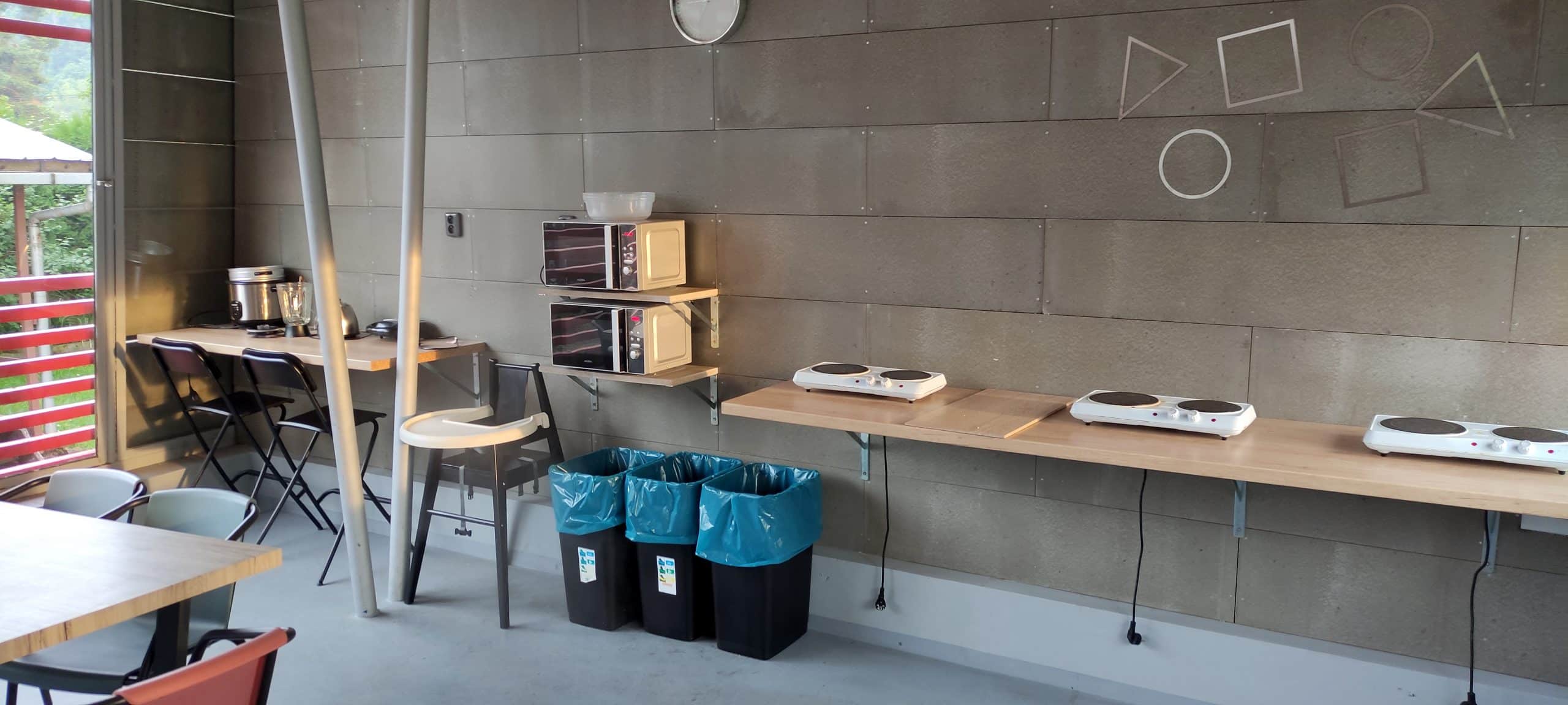 Součástí tohoto prostoru je i posezení, kde si můžete poklábosit při přípravě jídla a za deštivého počasí se zde i uchýlit do tepla a sucha. Dostupné jsou i zásuvky, takže i mobilní telefony zde dostanou vše potřebné. Navíc máte při přípravě jídla hezký výhled na stanovou louku a tak jste vlastně pořád v kontaktu. V kuchyňce se jistě potkáte s ostatními návštěvníky a je to takové centrum pro společné seznámení a klábosení.